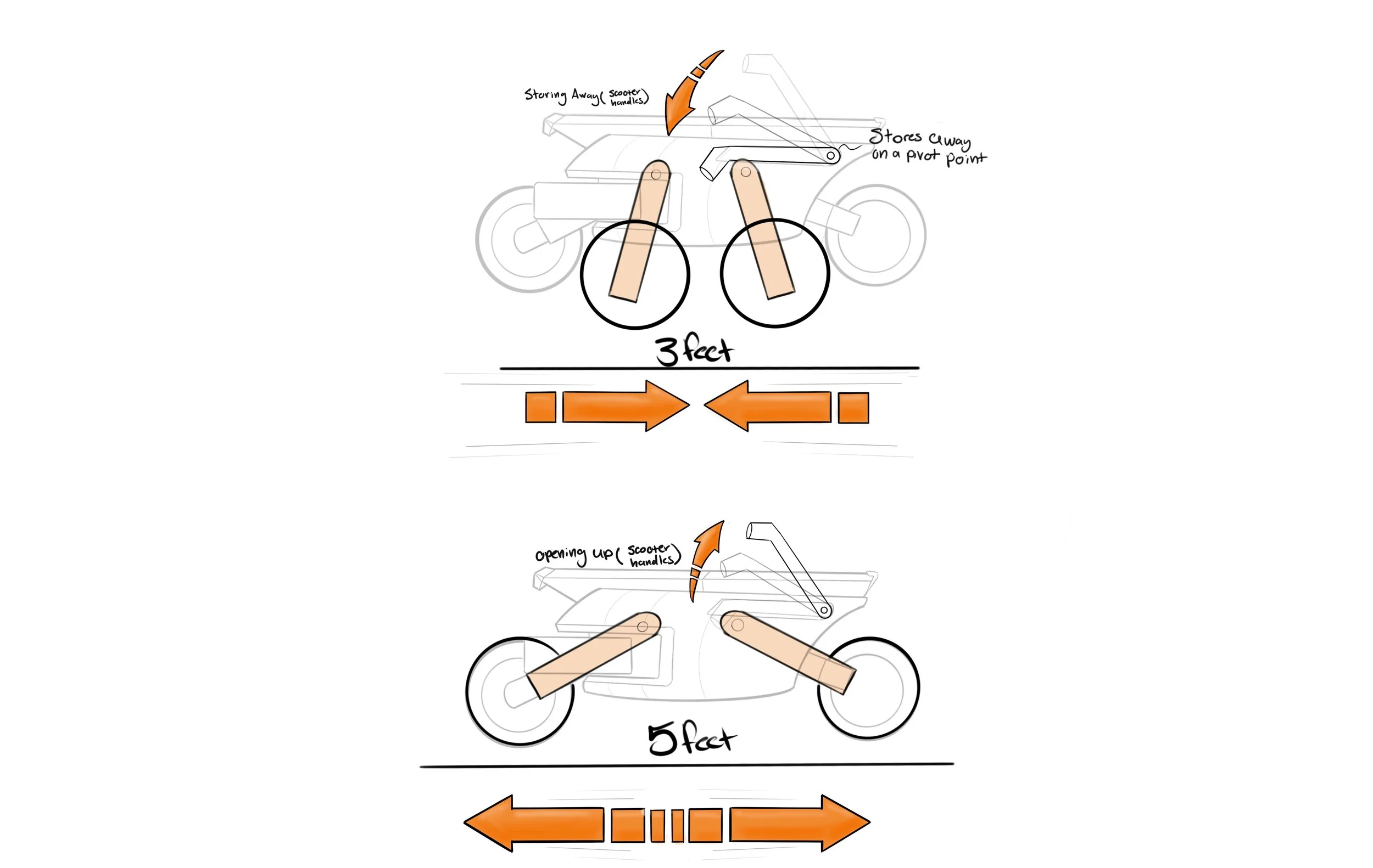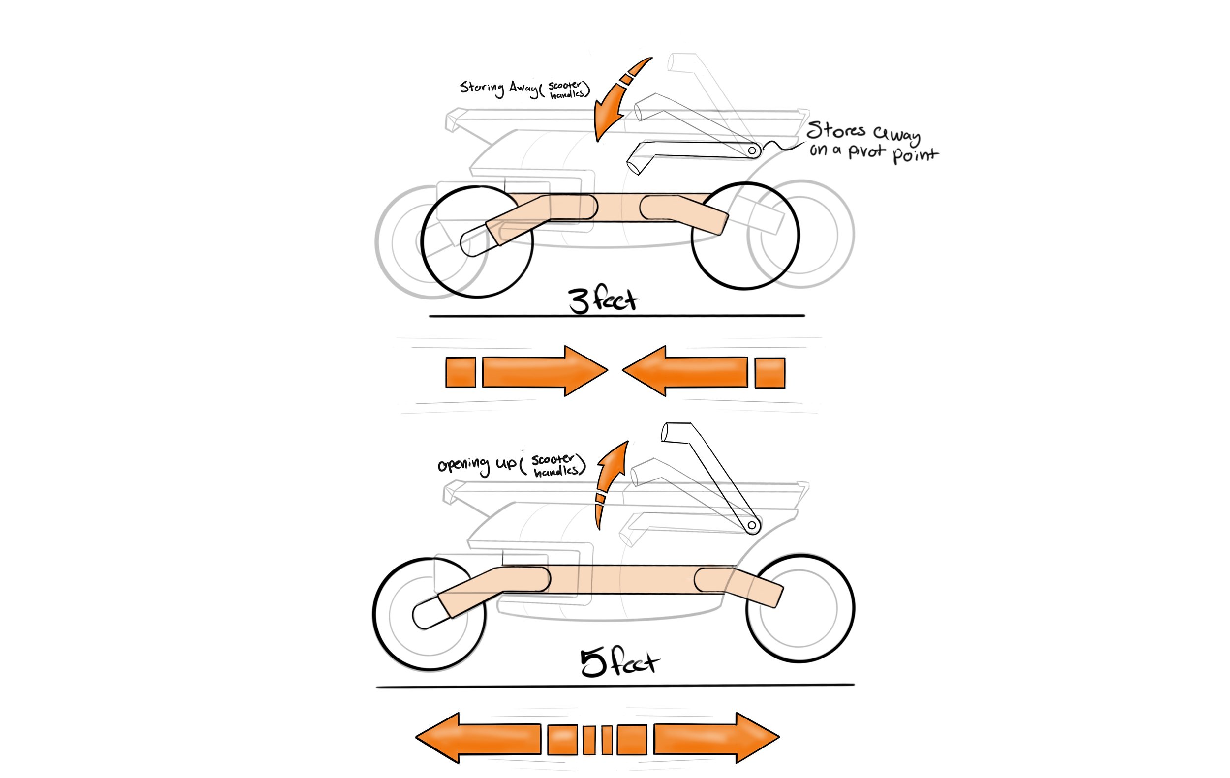 The storage method for concept 2 is a folding method. The wheels would slide under the chassis on a track system when stored away to reduce the bike’s footprint.